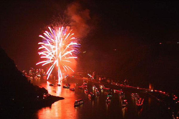 Die Stadt St.Goar veranstaltet zu Füßen der Loreley und den romantischen Burgen Rheinfels und Katz seit mehr als 70 Jahren das traditionelle Feuerwerksspektakel. Wenn am Abend die bunt beleuchtete Fahrgastschiffe in der Mitte des Rheines liegen, kann das gigantische Lichterfestival rechts und links am Ufer beginnen, das Finale erfolgt schließlich von der Mitte des Rheins.