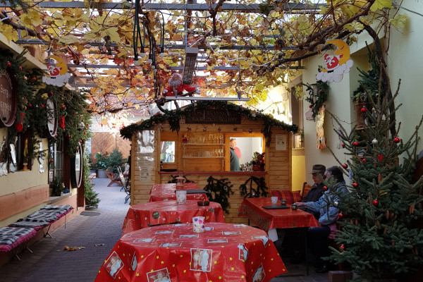 Wer nach dem Glühwein beim Weingut Philipp weiter trinken und etwas Essen möchte, sollte auf jeden Fall reservieren, da es nur eine beschränkte Anzahl an Plätzen im Innenbereich gibt.